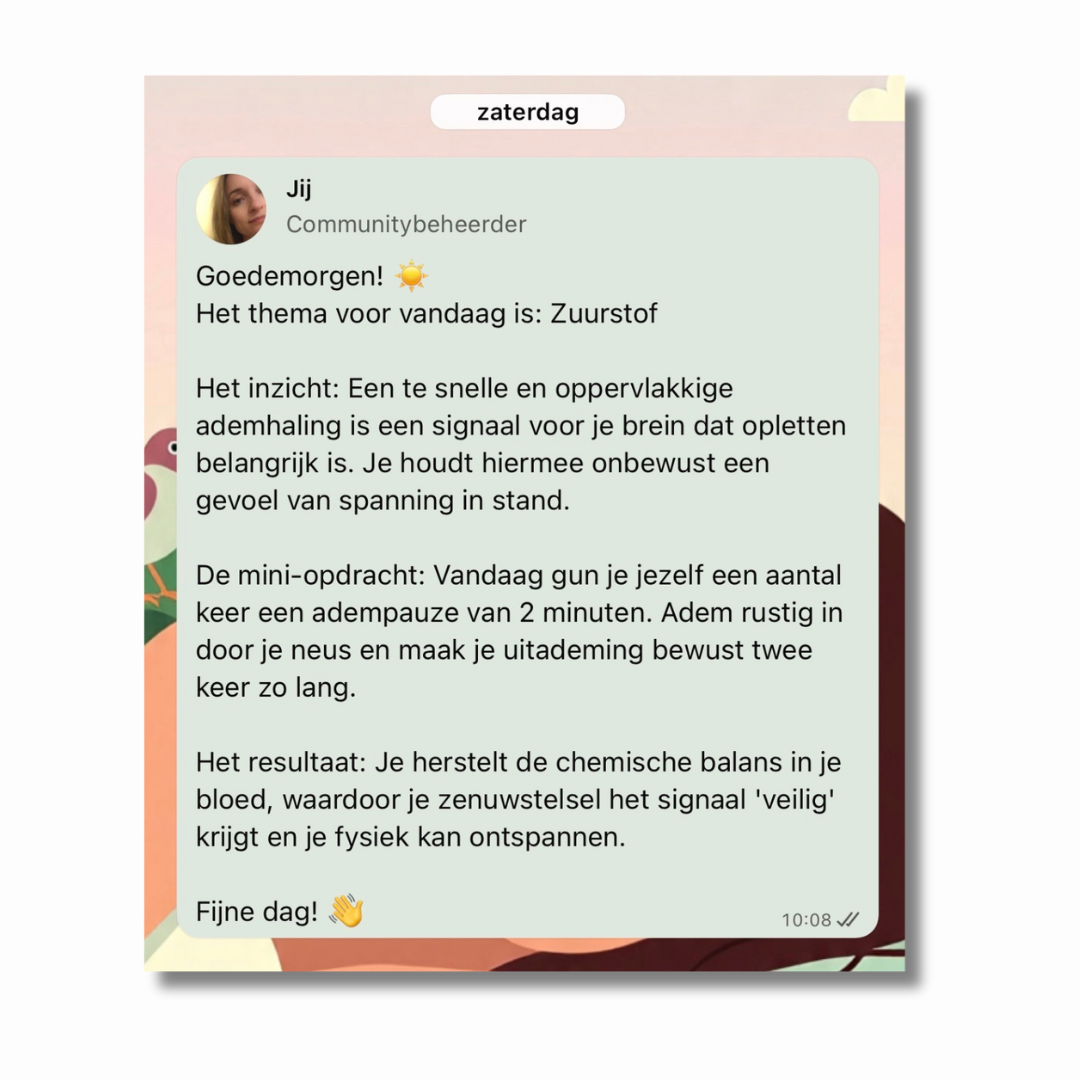Nee. Het is geen cursus, maar een dagelijkse flow van inzichten en mini-opdrachten. Het is praktisch en kort, zodat je het echt kunt toepassen.